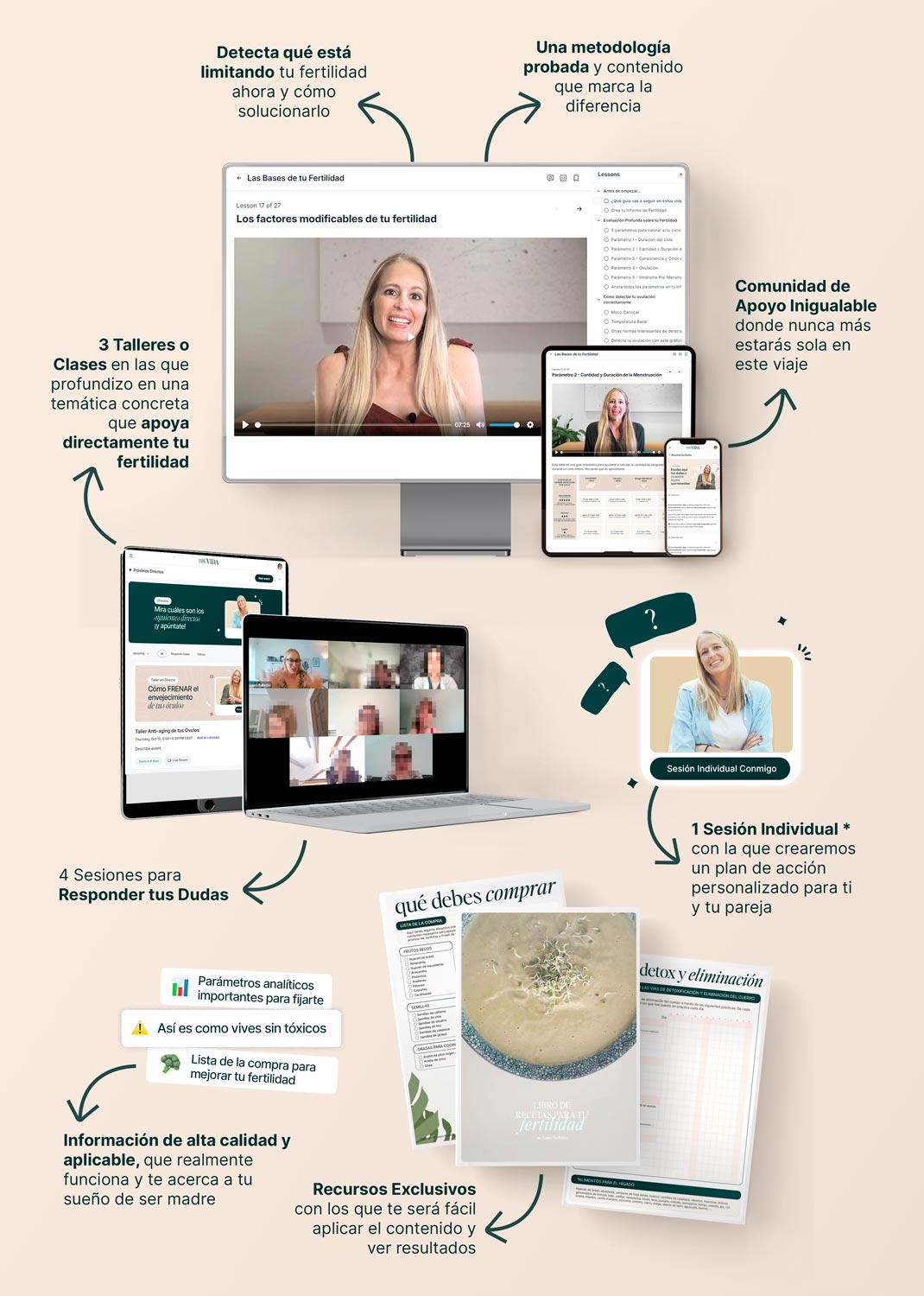 3 Talleres / Clases en las que Profundizo en una Temática Concreta que apoya Directamente tu Fertilidad. Están llenas de consejos prácticos para que apliques la información fácilmente. Hablo de temas como: cómo frenar el ritmo en que envejecen tus óvulos, qué hacer para mejorar el seminograma de tu pareja, cómo minimizar los tóxicos que perjudican tu fertilidad, cuáles son los nutrientes clave que debes incluir en tus comidas para preparar tu cuerpo para el embarazo, …